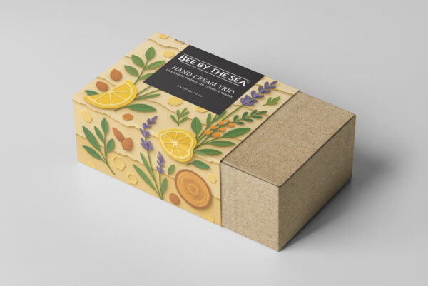 Bee By The Sea approached me to assist in designing a box sleeve for a hand cream gift set. They also needed a new label design for their lip balms, display packaging for each flavour as well as a package design for a 4-pack lip balm set.